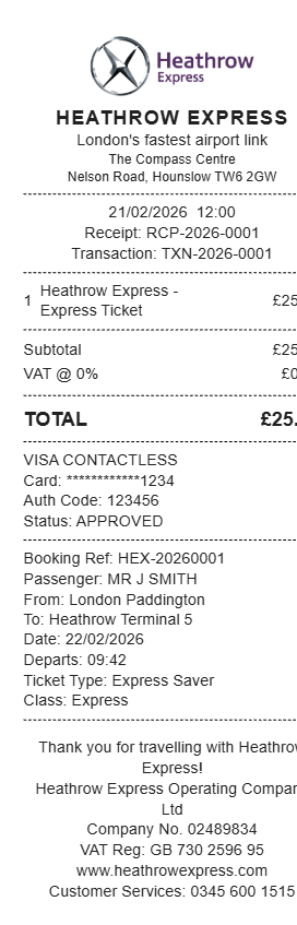 Preview our Heathrow Express receipt template below. This example shows the realistic layout and formatting you can expect. Every field is fully customizable — adjust items, prices, dates, and more to match your needs.