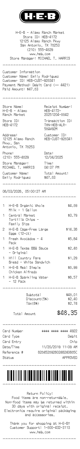 Preview our H-E-B receipt template below. This example shows the realistic layout and formatting you can expect. Every field is fully customizable — adjust items, prices, dates, and more to match your needs.
