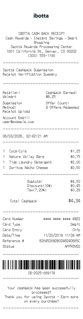 Preview our Ibotta receipt template below. This example shows the realistic layout and formatting you can expect. Every field is fully customizable — adjust items, prices, dates, and more to match your needs.
