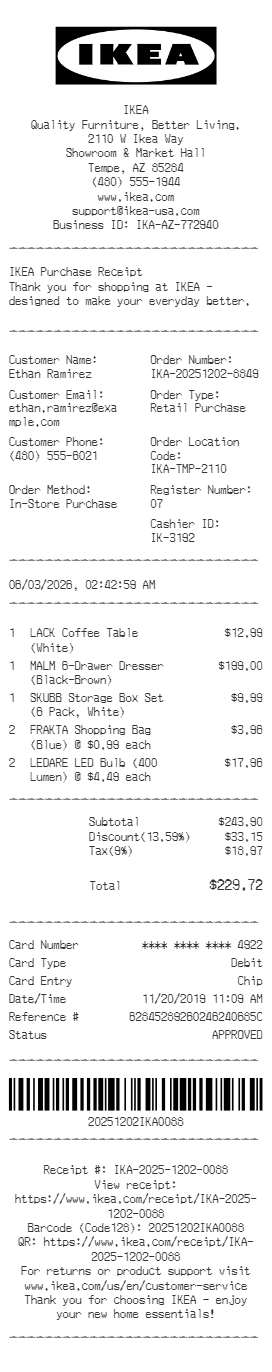 Preview our IKEA receipt template below. This example shows the realistic layout and formatting you can expect. Every field is fully customizable — adjust items, prices, dates, and more to match your needs.