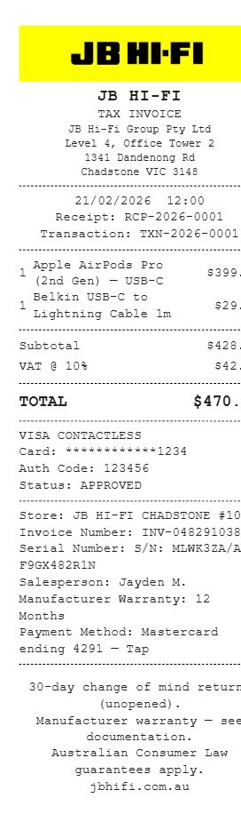 Preview our JB Hi-Fi receipt template below. This example shows the realistic layout and formatting you can expect. Every field is fully customizable — adjust items, prices, dates, and more to match your needs.