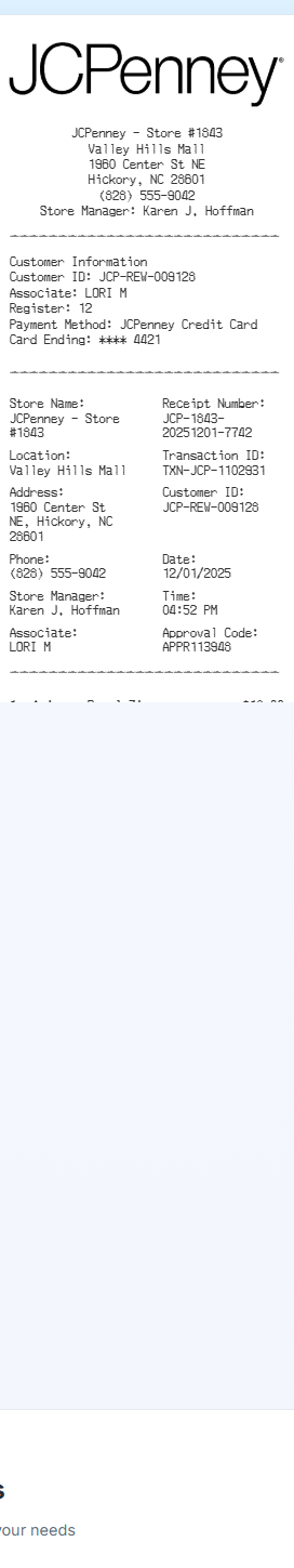 Preview our JCPenney receipt template below. This example shows the realistic layout and formatting you can expect. Every field is fully customizable — adjust items, prices, dates, and more to match your needs.