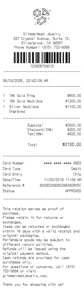 Preview our Jewelry receipt template below. This example shows the realistic layout and formatting you can expect. Every field is fully customizable — adjust items, prices, dates, and more to match your needs.
