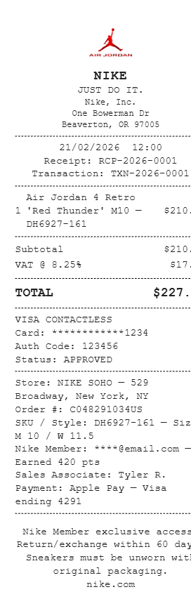 Preview our Jordan 4 receipt template below. This example shows the realistic layout and formatting you can expect. Every field is fully customizable — adjust items, prices, dates, and more to match your needs.