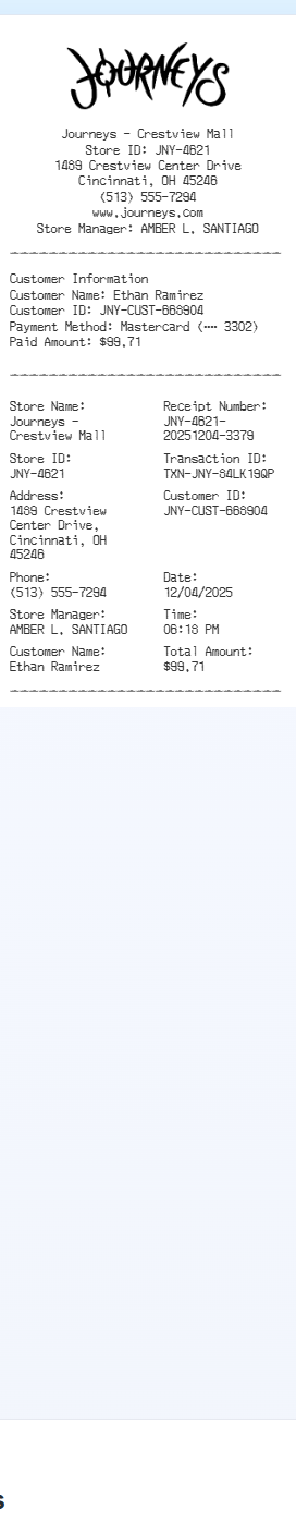 Preview our Journeys receipt template below. This example shows the realistic layout and formatting you can expect. Every field is fully customizable — adjust items, prices, dates, and more to match your needs.