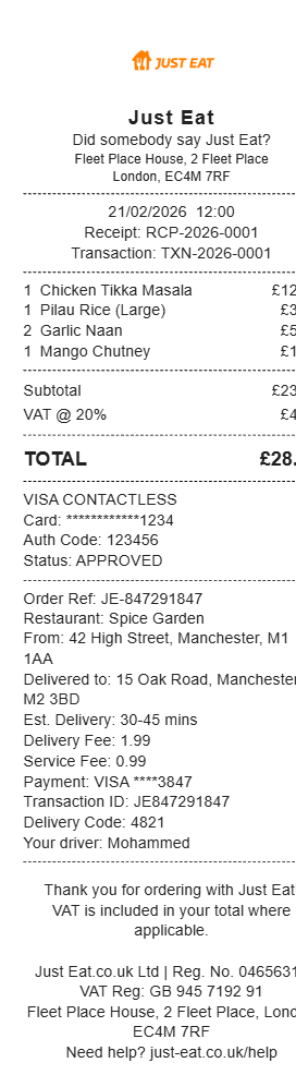 Preview our Just Eat receipt template below. This example shows the realistic layout and formatting you can expect. Every field is fully customizable — adjust items, prices, dates, and more to match your needs.