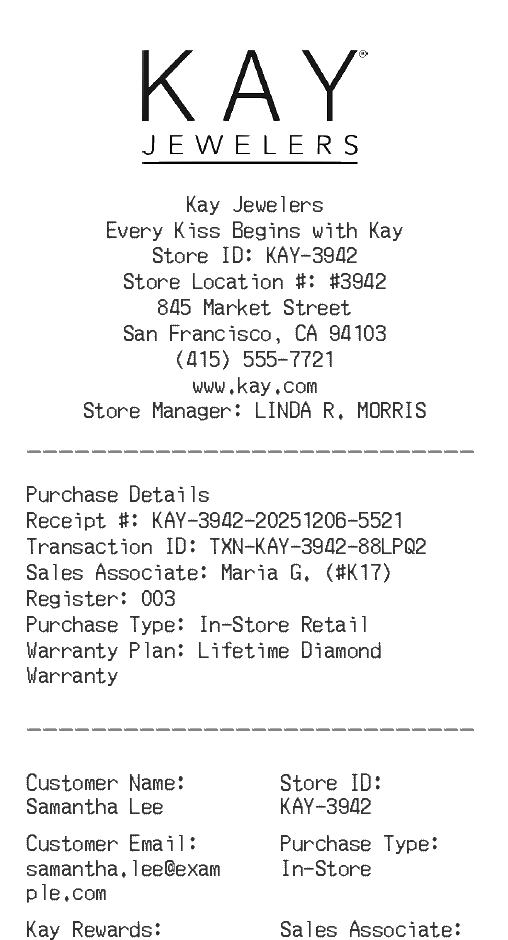 Preview our Kay Jewelers receipt template below. This example shows the realistic layout and formatting you can expect. Every field is fully customizable — adjust items, prices, dates, and more to match your needs.