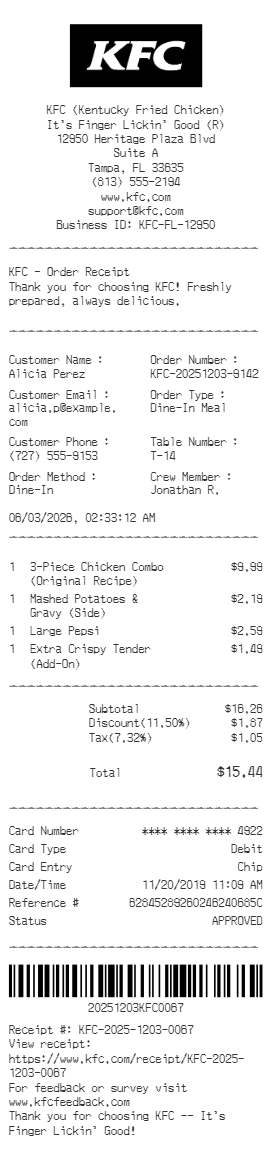 Preview our KFC receipt template below. This example shows the realistic layout and formatting you can expect. Every field is fully customizable — adjust items, prices, dates, and more to match your needs.