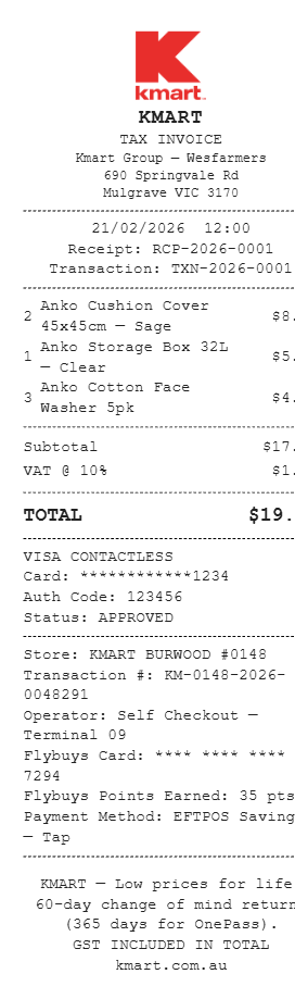 Preview our Kmart receipt template below. This example shows the realistic layout and formatting you can expect. Every field is fully customizable — adjust items, prices, dates, and more to match your needs.
