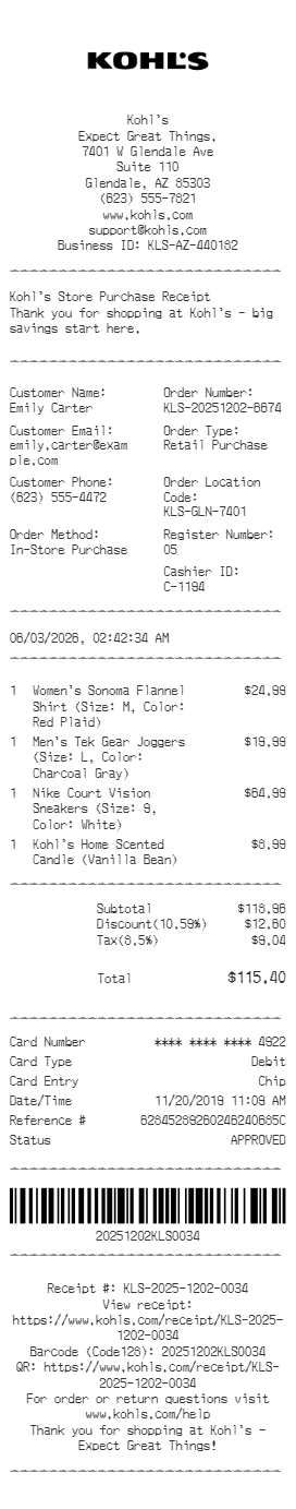 Preview our Kohl's receipt template below. This example shows the realistic layout and formatting you can expect. Every field is fully customizable — adjust items, prices, dates, and more to match your needs.
