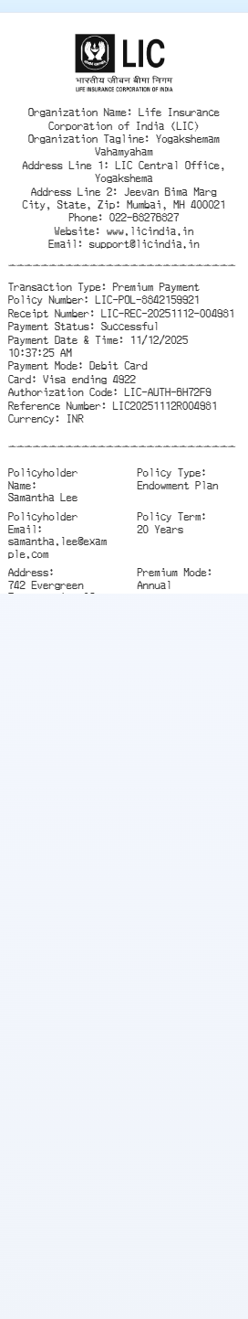 Preview our Lic receipt template below. This example shows the realistic layout and formatting you can expect. Every field is fully customizable — adjust items, prices, dates, and more to match your needs.