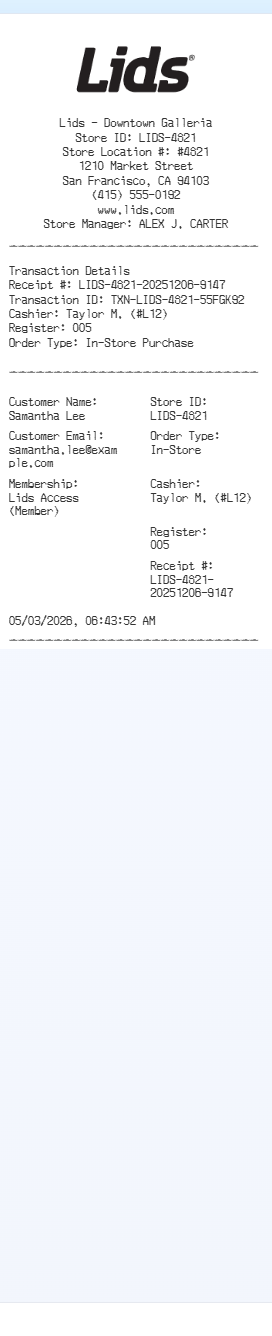 Preview our Lids receipt template below. This example shows the realistic layout and formatting you can expect. Every field is fully customizable — adjust items, prices, dates, and more to match your needs.