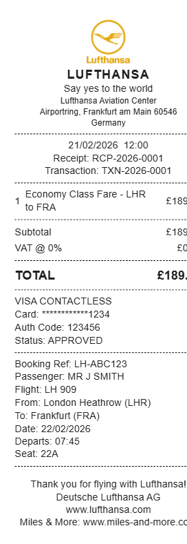 Preview our Lufthansa receipt template below. This example shows the realistic layout and formatting you can expect. Every field is fully customizable — adjust items, prices, dates, and more to match your needs.