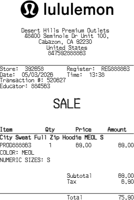 Preview our Lululemon receipt template below. This example shows the realistic layout and formatting you can expect. Every field is fully customizable — adjust items, prices, dates, and more to match your needs.