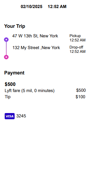 Preview our Lyft receipt template below. This example shows the realistic layout and formatting you can expect. Every field is fully customizable — adjust items, prices, dates, and more to match your needs.