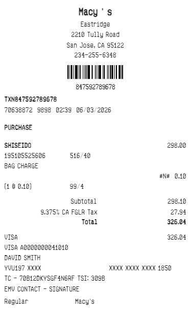 Preview our Macy receipt template below. This example shows the realistic layout and formatting you can expect. Every field is fully customizable — adjust items, prices, dates, and more to match your needs.
