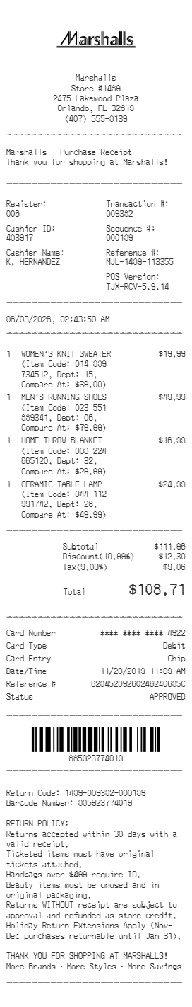 Preview our Marshalls receipt template below. This example shows the realistic layout and formatting you can expect. Every field is fully customizable — adjust items, prices, dates, and more to match your needs.