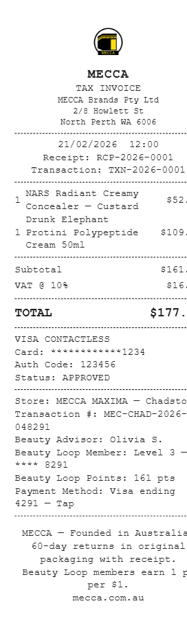 Preview our Mecca receipt template below. This example shows the realistic layout and formatting you can expect. Every field is fully customizable — adjust items, prices, dates, and more to match your needs.