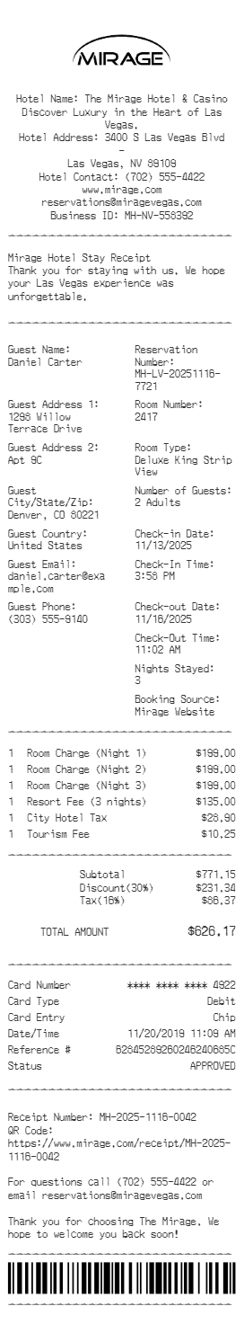 Preview our Mirage receipt template below. This example shows the realistic layout and formatting you can expect. Every field is fully customizable — adjust items, prices, dates, and more to match your needs.