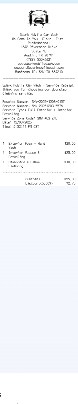 Preview our Mobile Car Wash receipt template below. This example shows the realistic layout and formatting you can expect. Every field is fully customizable — adjust items, prices, dates, and more to match your needs.