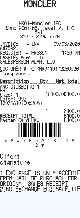 Preview our Moncler receipt template below. This example shows the realistic layout and formatting you can expect. Every field is fully customizable — adjust items, prices, dates, and more to match your needs.