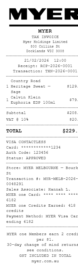 Preview our Myer receipt template below. This example shows the realistic layout and formatting you can expect. Every field is fully customizable — adjust items, prices, dates, and more to match your needs.