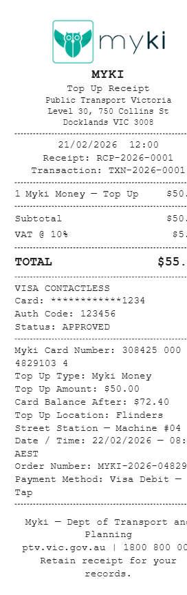 Preview our Myki receipt template below. This example shows the realistic layout and formatting you can expect. Every field is fully customizable — adjust items, prices, dates, and more to match your needs.