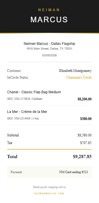 Preview our Neiman Marcus receipt template below. This example shows the realistic layout and formatting you can expect. Every field is fully customizable — adjust items, prices, dates, and more to match your needs.