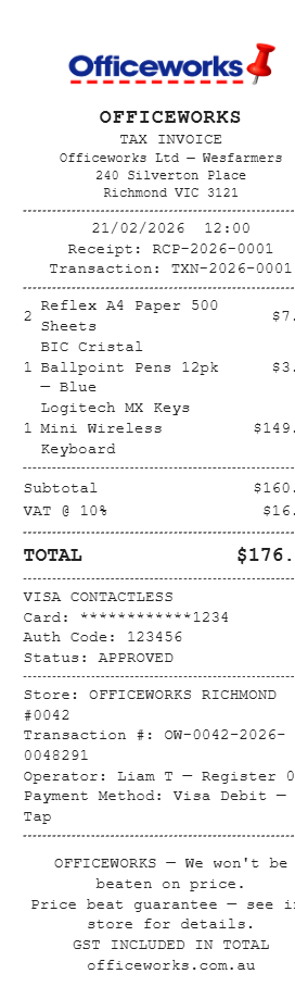 Preview our Officeworks receipt template below. This example shows the realistic layout and formatting you can expect. Every field is fully customizable — adjust items, prices, dates, and more to match your needs.