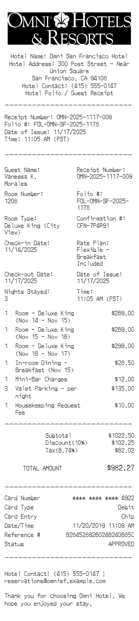 Preview our Omni Hotel receipt template below. This example shows the realistic layout and formatting you can expect. Every field is fully customizable — adjust items, prices, dates, and more to match your needs.