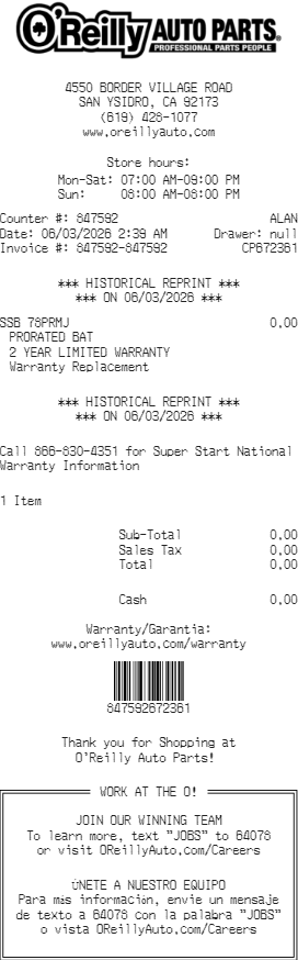 Preview our Oreilly Auto Parts receipt template below. This example shows the realistic layout and formatting you can expect. Every field is fully customizable — adjust items, prices, dates, and more to match your needs.