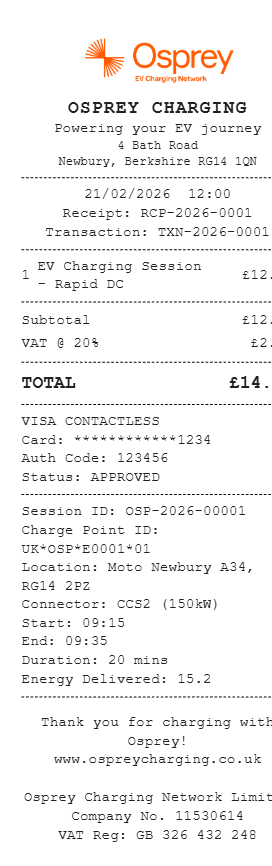 Preview our Osprey Charging receipt template below. This example shows the realistic layout and formatting you can expect. Every field is fully customizable — adjust items, prices, dates, and more to match your needs.