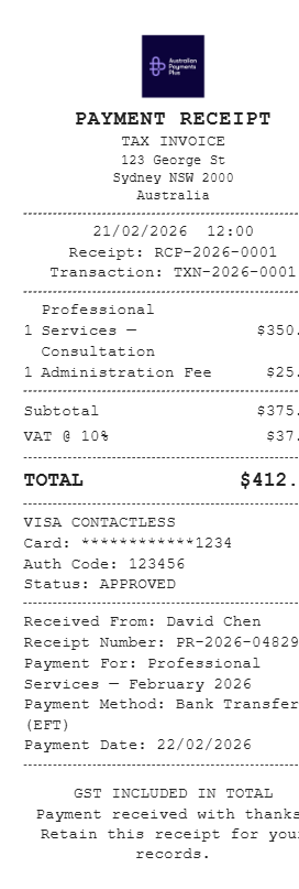 Preview our Payment Receipt Australia receipt template below. This example shows the realistic layout and formatting you can expect. Every field is fully customizable — adjust items, prices, dates, and more to match your needs.