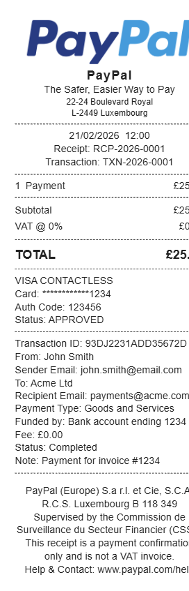 Preview our PayPal receipt template below. This example shows the realistic layout and formatting you can expect. Every field is fully customizable — adjust items, prices, dates, and more to match your needs.
