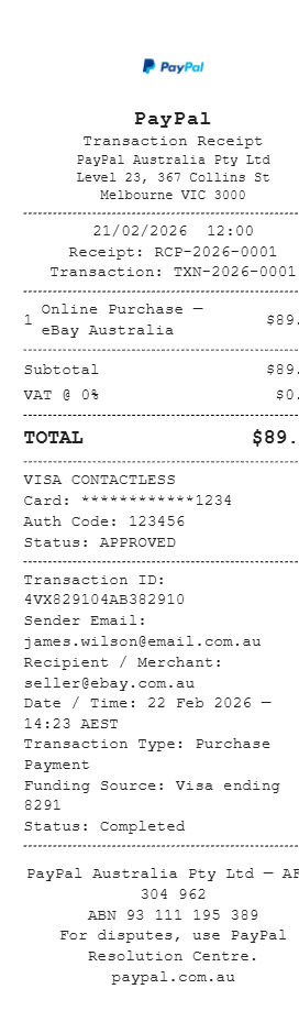 Preview our PayPal Australia receipt template below. This example shows the realistic layout and formatting you can expect. Every field is fully customizable — adjust items, prices, dates, and more to match your needs.