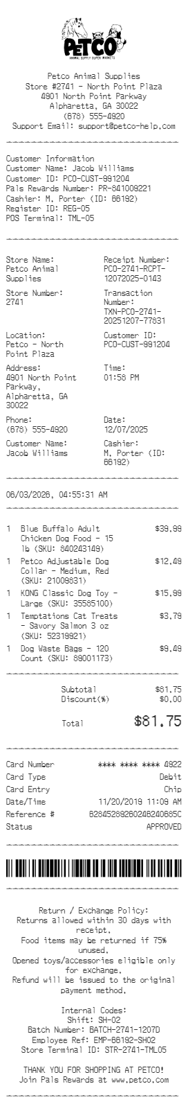 Preview our Petco receipt template below. This example shows the realistic layout and formatting you can expect. Every field is fully customizable — adjust items, prices, dates, and more to match your needs.