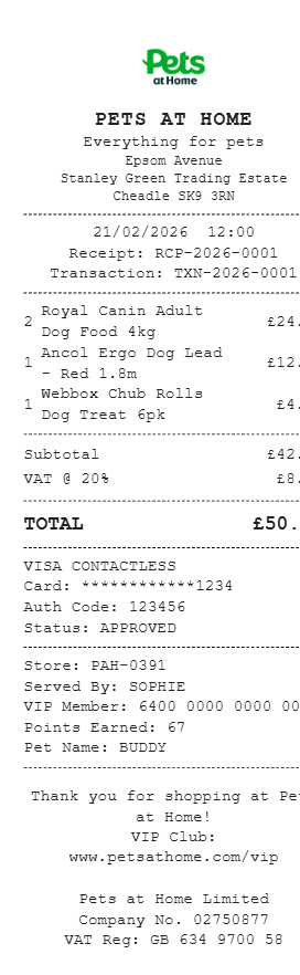 Preview our Pets At Home receipt template below. This example shows the realistic layout and formatting you can expect. Every field is fully customizable — adjust items, prices, dates, and more to match your needs.
