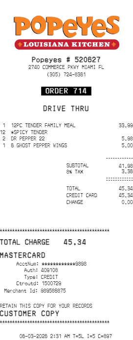 Preview our Popeyes receipt template below. This example shows the realistic layout and formatting you can expect. Every field is fully customizable — adjust items, prices, dates, and more to match your needs.