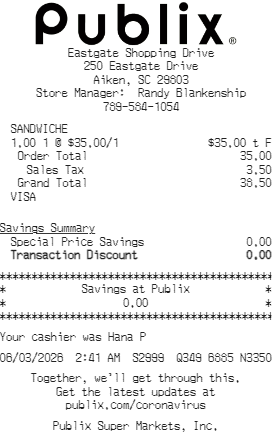 Preview our Publix receipt template below. This example shows the realistic layout and formatting you can expect. Every field is fully customizable — adjust items, prices, dates, and more to match your needs.