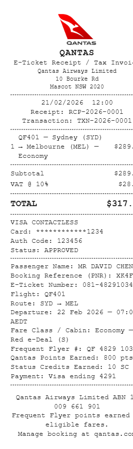 Preview our Qantas receipt template below. This example shows the realistic layout and formatting you can expect. Every field is fully customizable — adjust items, prices, dates, and more to match your needs.
