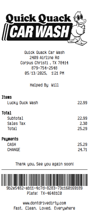Preview our Quick Quack Car Wash receipt template below. This example shows the realistic layout and formatting you can expect. Every field is fully customizable — adjust items, prices, dates, and more to match your needs.