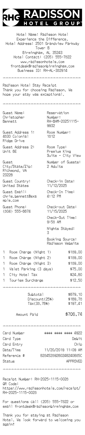 Preview our Radisson receipt template below. This example shows the realistic layout and formatting you can expect. Every field is fully customizable — adjust items, prices, dates, and more to match your needs.