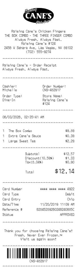 Preview our Raisings Cane receipt template below. This example shows the realistic layout and formatting you can expect. Every field is fully customizable — adjust items, prices, dates, and more to match your needs.