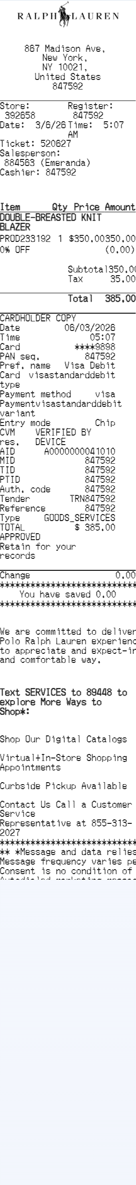 Preview our Ralph Lauren receipt template below. This example shows the realistic layout and formatting you can expect. Every field is fully customizable — adjust items, prices, dates, and more to match your needs.