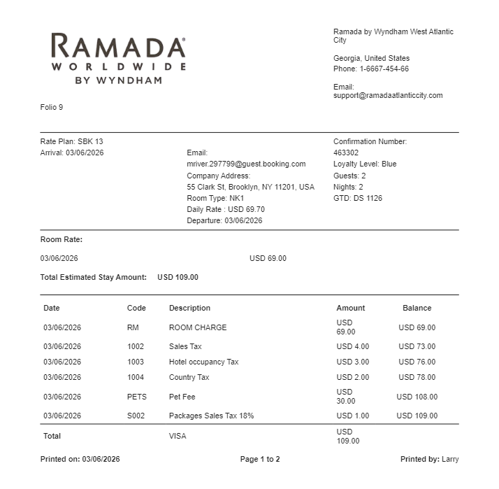 Preview our Ramada receipt template below. This example shows the realistic layout and formatting you can expect. Every field is fully customizable — adjust items, prices, dates, and more to match your needs.