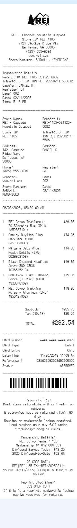 Preview our REI receipt template below. This example shows the realistic layout and formatting you can expect. Every field is fully customizable — adjust items, prices, dates, and more to match your needs.