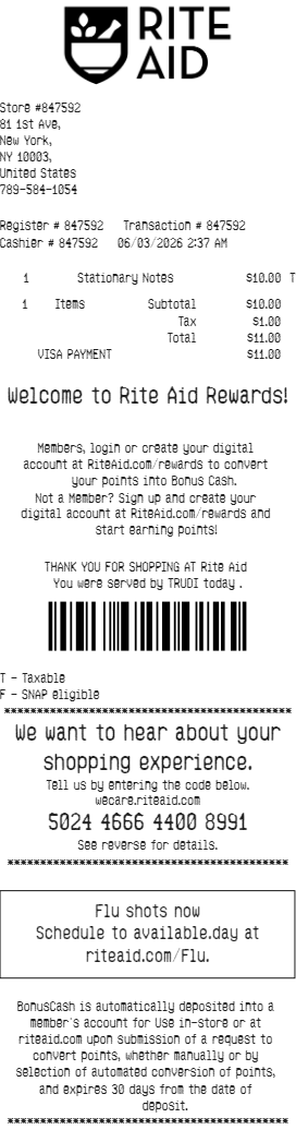 Preview our Rite Aid receipt template below. This example shows the realistic layout and formatting you can expect. Every field is fully customizable — adjust items, prices, dates, and more to match your needs.