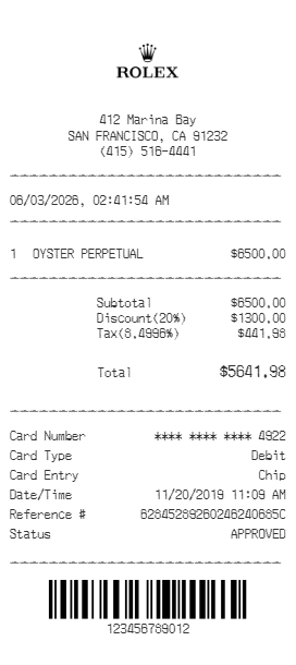 Preview our Rolex receipt template below. This example shows the realistic layout and formatting you can expect. Every field is fully customizable — adjust items, prices, dates, and more to match your needs.