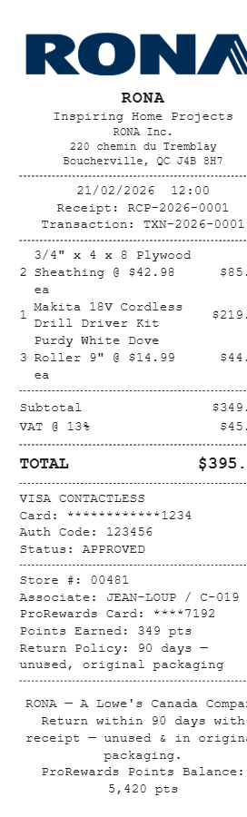 Preview our Rona Canada receipt template below. This example shows the realistic layout and formatting you can expect. Every field is fully customizable — adjust items, prices, dates, and more to match your needs.