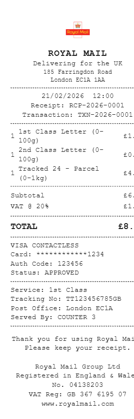 Preview our Royal Mail receipt template below. This example shows the realistic layout and formatting you can expect. Every field is fully customizable — adjust items, prices, dates, and more to match your needs.